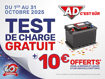 *Offre valable du 1er au 31 octobre 2025 uniquement chez les réparateurs participant à l’opération. L’offre comprend un contrôle de charge gratuit et une remise de 10€ pour la reprise, l’achat et la pose d’une nouvelle batterie réalisés le même jour. Offre réservée aux véhicules légers de moins de 3,5 tonnes appartenant aux catégories suivantes : coupé 2 portes, citadine, 4×4, VUL, berline et familiale. Consultez la liste des réparateurs participantsen cliquant ici >. Offre non cumulable avec d’autres promotions.